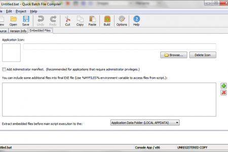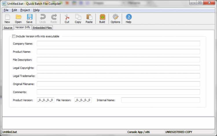 Quick Batch File Compiler - это программа поможет скомпилировать из batch-файла полноценный исполняемый EXE-файл, который сможет запускаться в Windows XP/Vista/7/8/10. Вместе с тем, программа позволяет заполнить и информацию о файле, включая название компании и продукта, описание файла, информацию об авторских правах и торговых марках, номере версии и пр, а также добавить иконку.