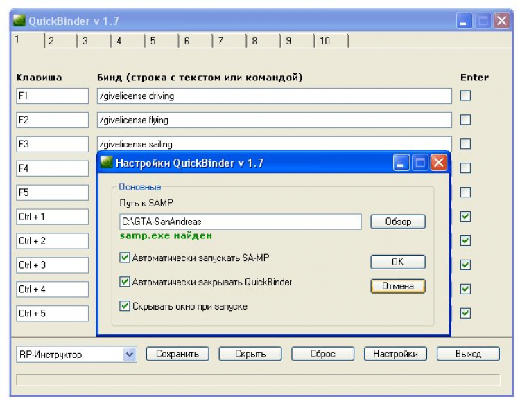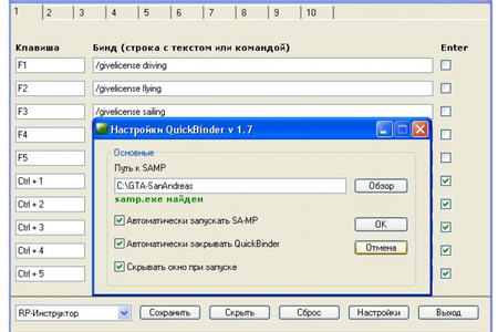 - Автоматический запуск sa-mp, что позволяет открывать QuickBinder samp, а вместе с ним автоматический откроется samp.