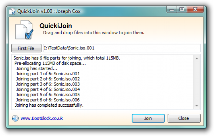 QuickiJoin Эта утилита позволяет легко и быстро объединять файлы, которые были разбиты на несколько частей. Добавлять части файлов можно простым перетаскиваем их в окно программы или на ее иконку, используя встроенный файловый менеджер или же командную строку.