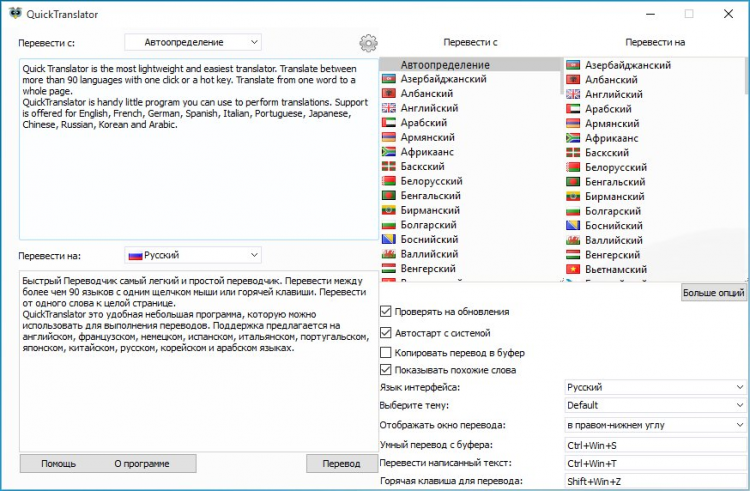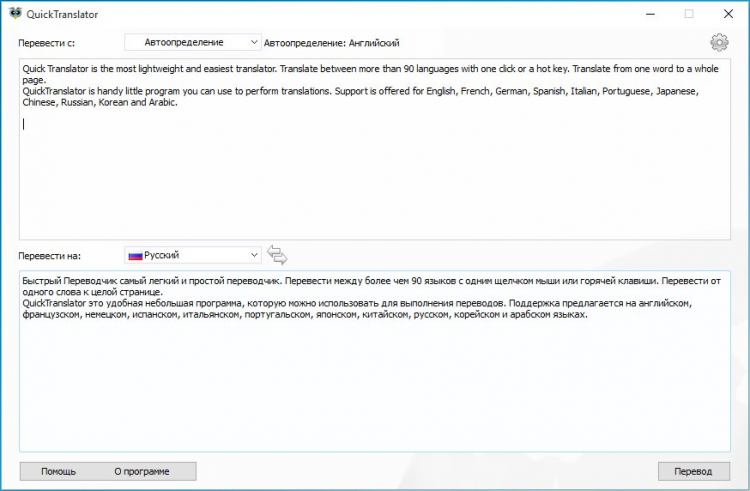 Она имеет довольно небольшие размеры и минималистический интерфейс в котором собраны все нужные Вам настройки для удобного перевода. Для понимания всех возможностей программы она имеет встроенную помощь. Возможно Вы уже пользовались подобными функциями перевода в браузерах, теперь Вы можете использовать их во всей системе!