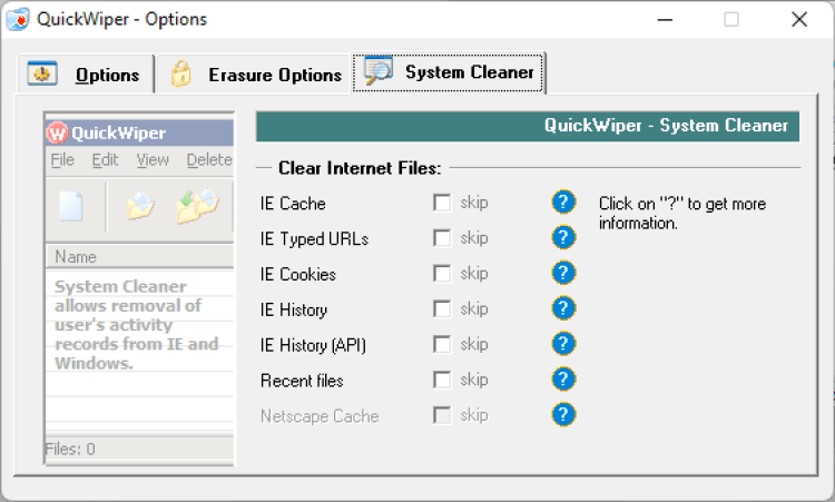 QuickWiper - это программа, которая служит для удаления cookies, истории посещения веб-страниц, кэша веб-браузеров, введенных URL-ссылок, временных файлов и пр.