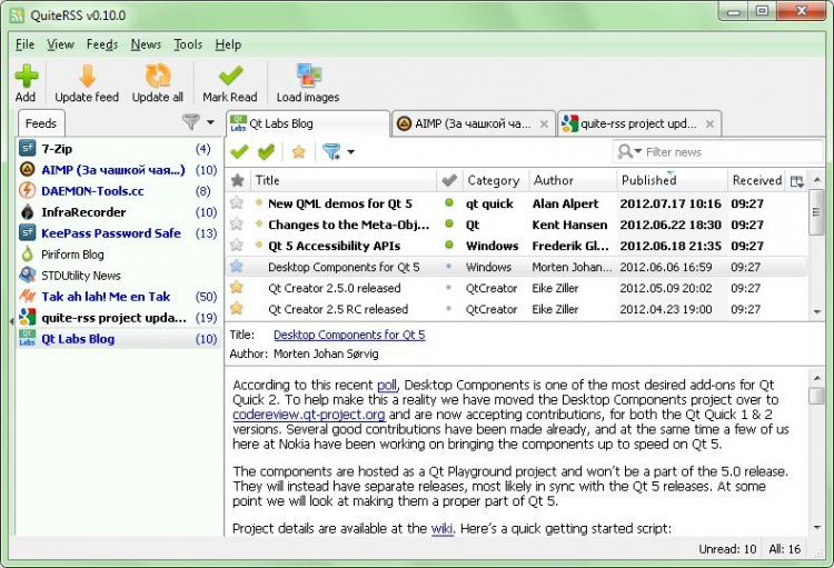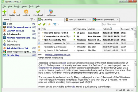 Удобная программа, предназначенная для чтения новостных RSS-лент. Она позволяет добавлять новостные ленты с сайтов или блогов и делить их на категории по темам. Есть функция автоматического обновления лент с заданным интервалом или при запуске программы.