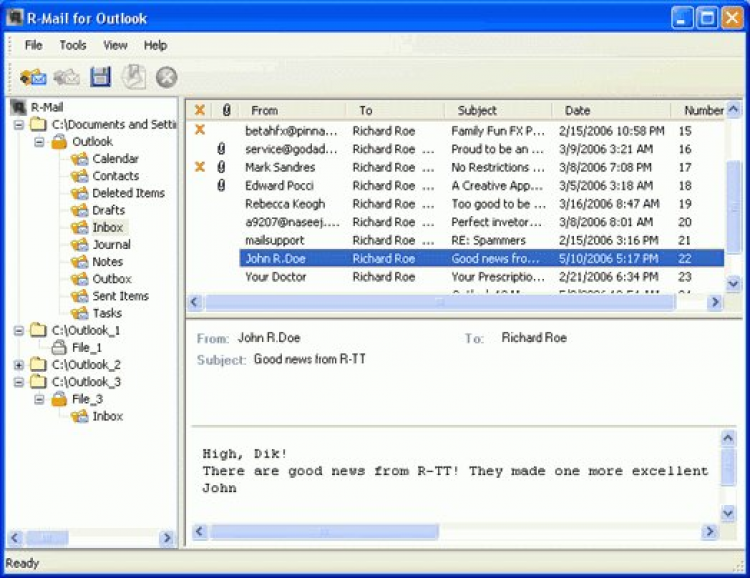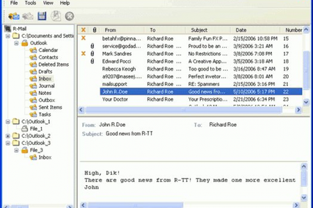 - Воссозданные данные могут быть просмотрены в R-Mail for Outlook, где интерфейс просмотра максимально приближен к Outlook, а затем импортированы и открыты в Outlook или Outlook Express.