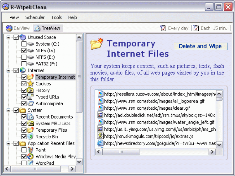 R-Wipe&Clean полностью удалит временные интернет файлы, журнал посещенных страниц, куки, автозаполняемые формы и пароли, файлы подкачки, список недавно использовавшихся документов, список часто используемых компонентов, хранящихся в системном реестре, временные файлы и т.д. Это сделает невозможным восстановление конфиденциальной информации о вашей сетевой или локальной активности.