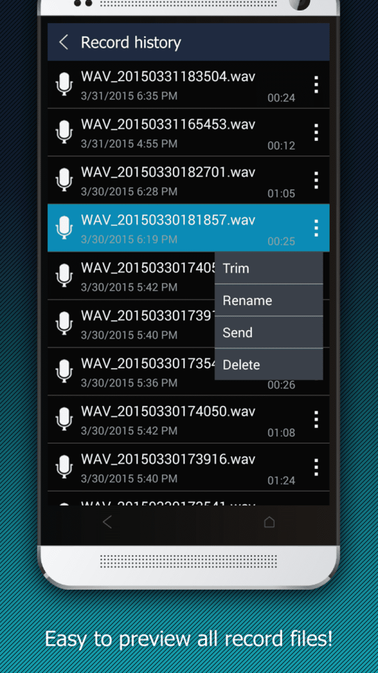Загрузить Voice Recorder стоит тем, кто ведет онлайн дневники или использует смартфон для создания заметок. Каждое такое сообщение будет сохранено без потери качества на нужном вам носителе. Записи можно сохранять, переносить, редактировать названия, сортировать, отправлять отрывки.