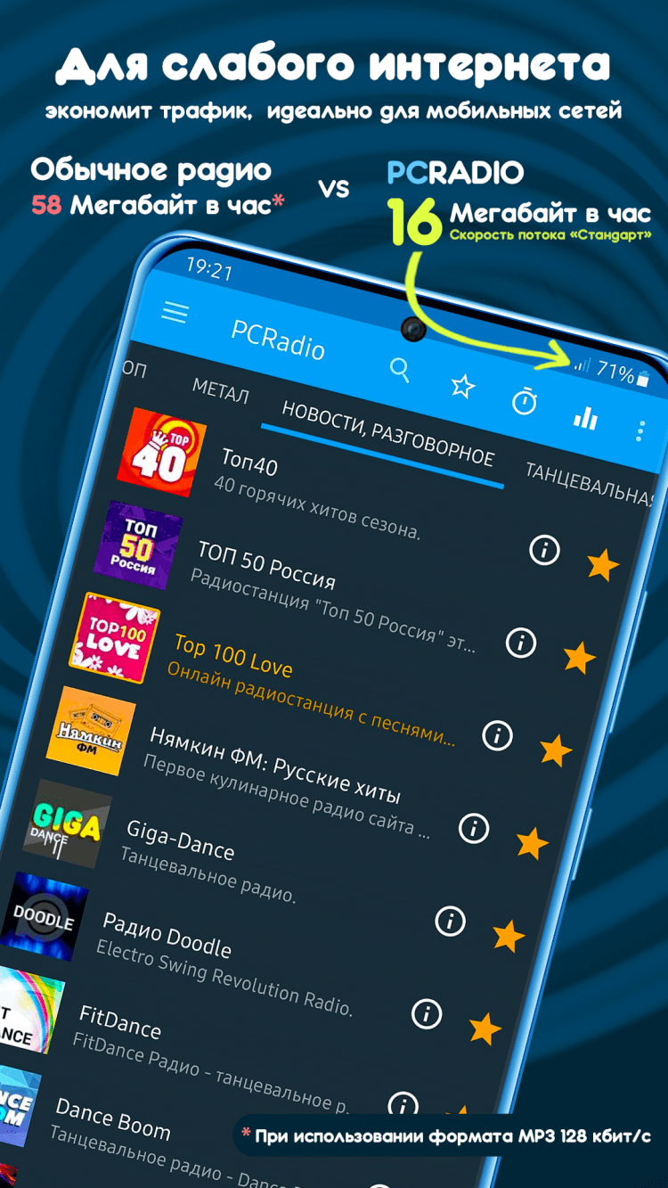 PCRADIO - софт для онлайн прослушивания русских и зарубежных интернет-радиостанций на мобильных устройствах и планшетах, работающих на системе Android. Разработанная система кодирования звука позволяет слушать радио на низкой скорости соединения с интернетом в хорошем качестве. Программа работает в сетях EDGE, 2G, 3G, 4G, Yota и Wi-Fi. Поддерживается русскоязычный интерфейс. Размер приложения — 1,74 МБ.