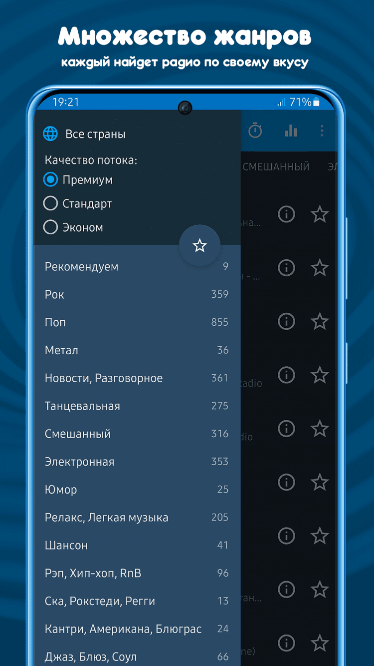- Встроены несколько тысяч радиостанций, сгруппированных по жанрам: электронная музыка, клубная, танцевальная, поп, релакс и другое.