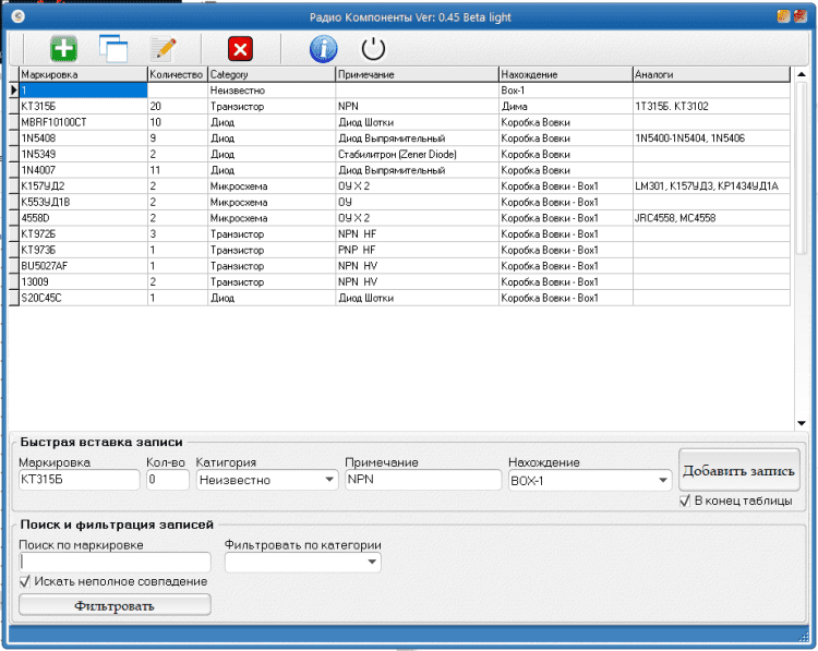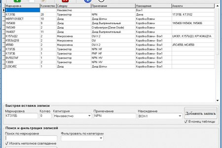 Простая база данных для пользователя под свои нужды. В основном ориентирована для хранения информации о радио-компонентах для радио-любителей и мастеров, но её вполне можно использовать для хранения информации о домашних лекарствах или даже рецептах, база гибкая так что каждый может использовать как хочет.