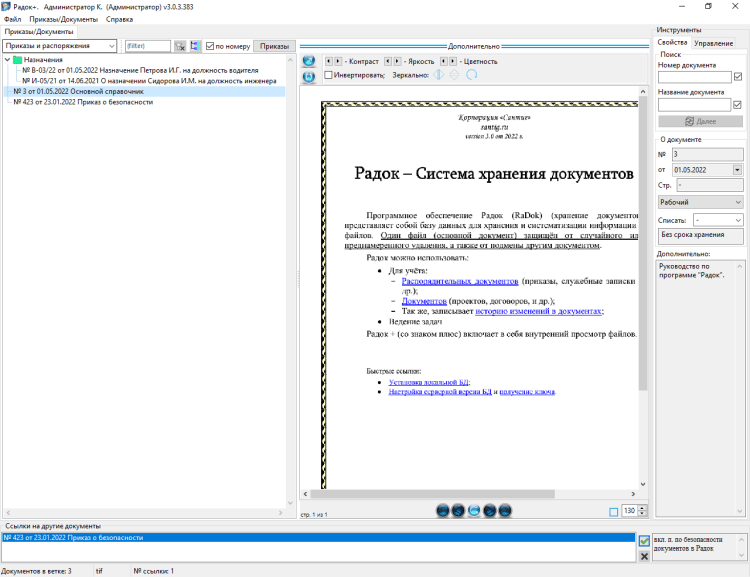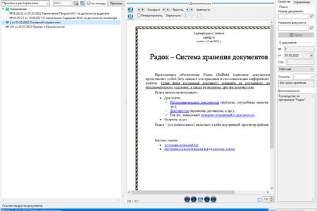 Хранение документов (Радок) представляет собой базу данных документов и файлов. ПО "Радок" предназначено для хранения и учёта распорядительных документов (приказы, служебные записки и др.) и иных документов (проектов, договоров, и др.), запоминает историю изменений документов.