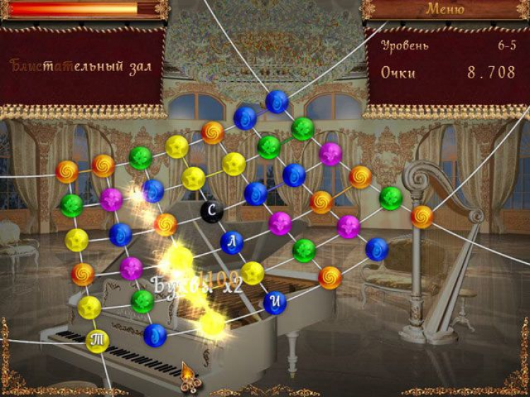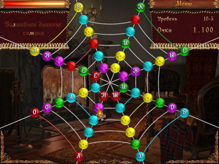 Меняйте местами разноцветные шарики на узелках паутины, чтобы получилась цепочка из трех и более одинаковых цветов. На некоторых шариках написаны буквы, из которых необходимо собрать название очередного предмета или помещения.