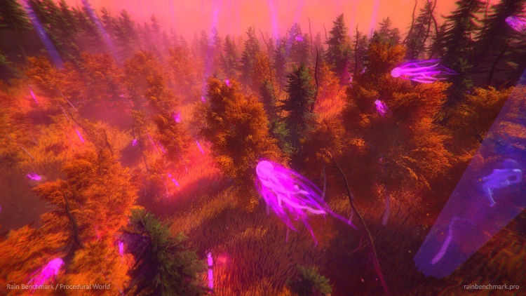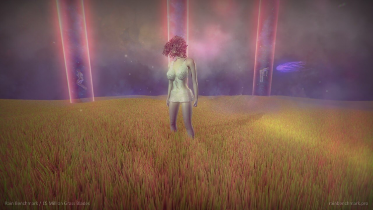 В зависимости от Seed, генерируется различный ландшафт. В тесте используется множество различных шейдеров, в том числе геометрический шейдер DX11 процедурной генерации травы и цветов. В тесте большое количество деревьев и различных частиц (облака, туман, листья и т.д.). А также различные пост эффекты, освещение и тени в реальном времени. Все это создает значительную нагрузку на GPU. В тесте большая нагрузка на ЦП, так как присутствует физика ткани, ветер, анимации и адаптивный искусственный интеллект. Генерация ландшафта происходит в реальном времени. 15 Million Grass Blades. Это тест для производительности GPU. Тест построен на движке Unity и движке процедурной генерации NVGEN. Основную нагрузку на GPU создает процедурно генерируемая трава (это сложный геометрический шейдер DX11).