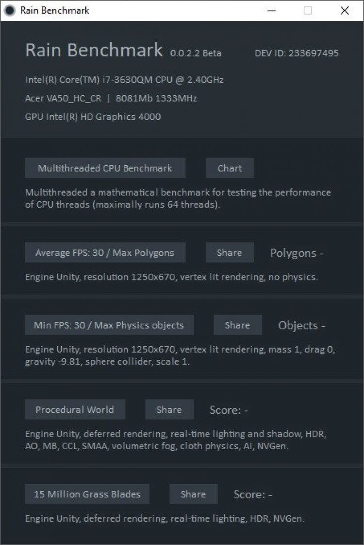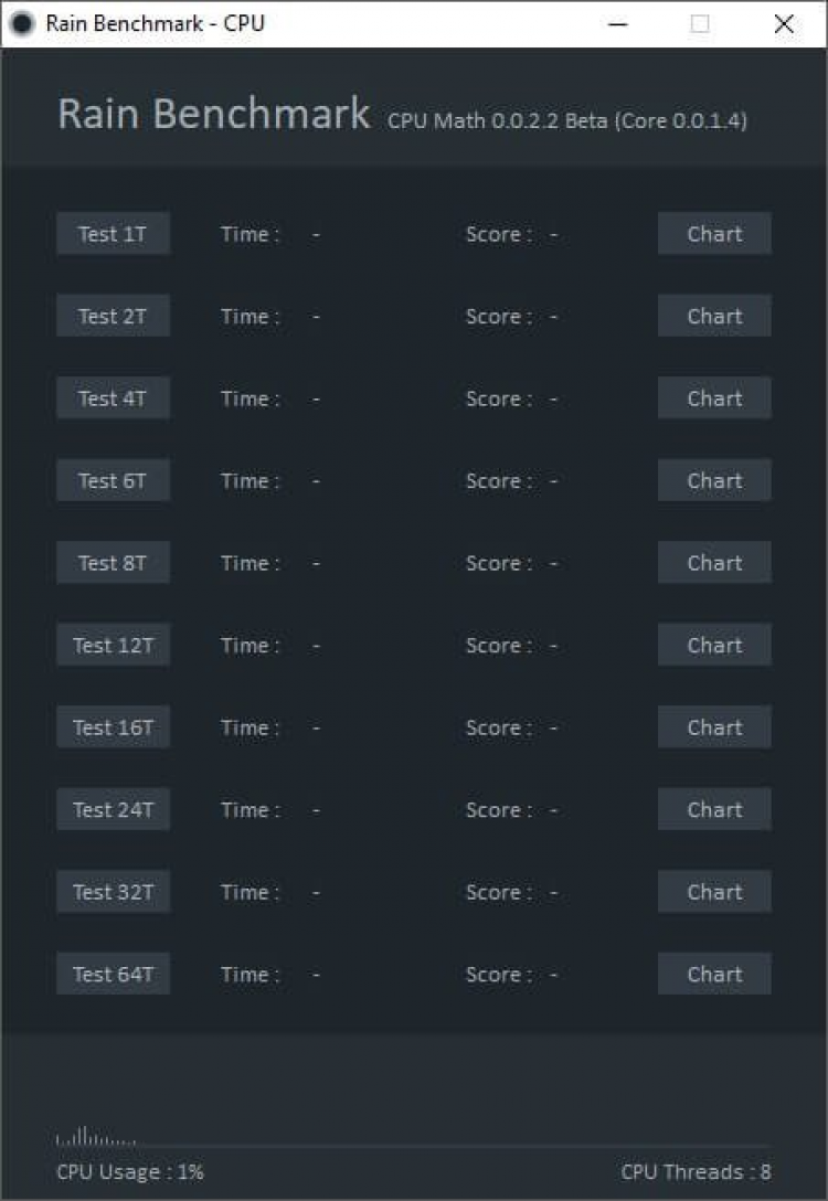 Rain Benchmark - это бенчмарк для тестирования производительности персонального компьютера. Тест состоит из 5 основных тестов. Имеет небольшой размер файла 20 МБ. Multithreaded CPU Benchmark.