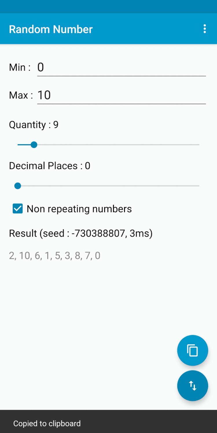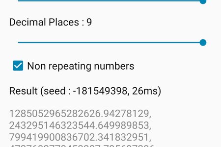 Random Number Генератор чисел для вашего мобильного устройства. Задайте диапазон от -999999999999999 до 9999999999999999 и количество желаемых чисел и приложение сгенерирует их для вас. Сгенерированные числа не будут повторяться.