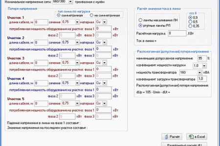 - развернутый расчет падения напряжения осветительной линии на не ограниченное число участков;