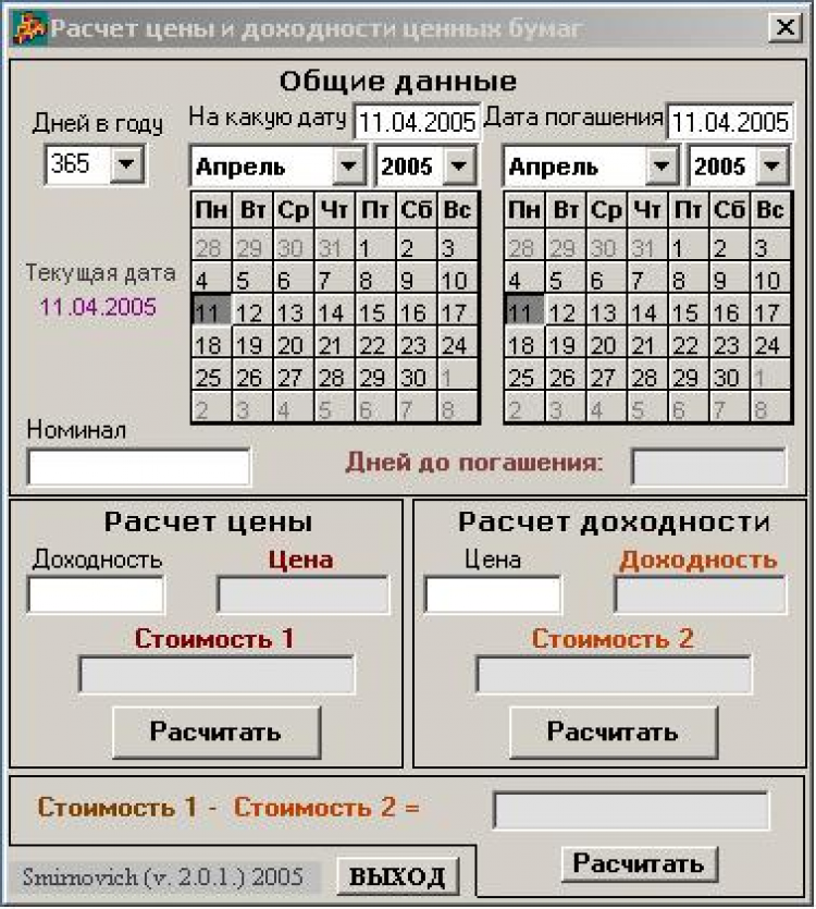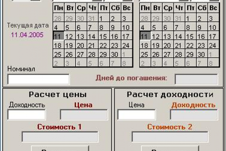 Специалист, забывая ввести или изменить те или иные параметры сделки, может просто пересчитать с новыми и старыми параметрами новую цену или доходность. Данная программа не позволяет повторно пересчитать цену и доходность при изменении, какого либо параметра. Она их просто стирает. Программа округляет автоматически значения при вводе и/или расчете: Цена до 4-х знаков после запятой; Доходность до 2-х знаков после запятой; Номинал и рассчитанные значения Стоимость 1 и Стоимость 2 до 2-х знаков после запятой. Еще в эту версию добавлен календарь, который позволяет вводить с него даты для расчетов и видеть, на какой день недели попадает дата погашения, что позволяет избежать попадания даты погашения на выходные (праздничные) дни или сделать соответствующие поправки в расчетах с учетом выходных (праздничных) дней. Для расчета цены используется следующая формула: Ц = 100 / (1 +Д / 100 * Т / 365), где Ц – цена; Д – доходность в % годовых; Т – срок обращения (определяется как разница между датой погашения и годовых; 365 – количество дней в году. Для расчета доходности используется следующая формула: Д = (100 - Ц) / Ц * 365 / Т * 100, где Д – доходность в % годовых; Ц – цена; Т – срок обращения (определяется как разница между датой погашения и годовых; 365 – количество дней в году. Для расчета стоимости используется следующая формула: С = Н * Ц / 100, где С – стоимость; Н – номинал; Ц – цена в % от номинала. Что значит «Стоимость 1», «Стоимость 2» и «Стоимость 1 – Стоимость 2» я думаю и так понятно. Представлены два файла: Дистрибутив полностью 3639 Кб и файл приложение 205 Кб. Если приложение не бужет работать, то необходимо воспользоваться дистрибутивом.