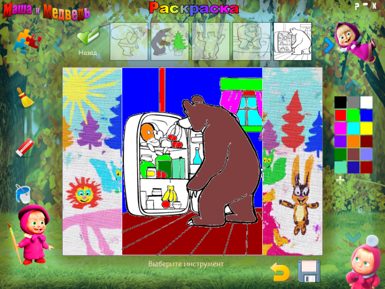 Раскраска Маша и Медведь конечно же понравится Вашему ребенку, и он проведет время с пользой, раскрашивая любимых героев мультфильма. Программа не требует регистрации и полностью бесплатная, и не смотря на это красивая, удобная и проста в использовании.