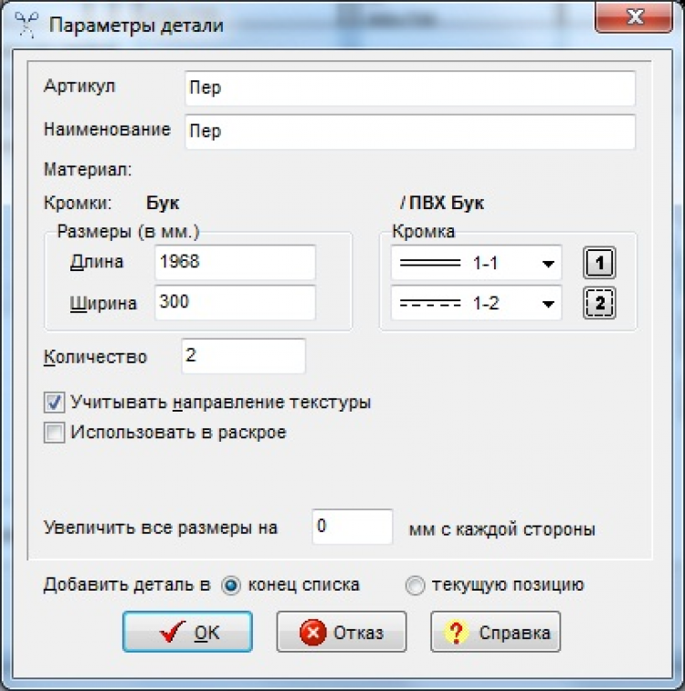 - Для каждой детали может быть задано произвольное символьное наименование, количество, наличие кромки (при изготовлении мебельных щитов).