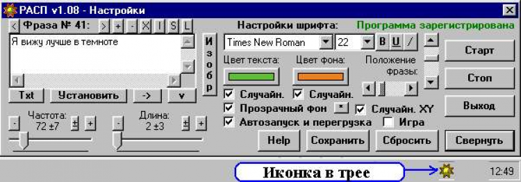 РАСП - работа с подсознанием - это программа, принцип действия которой основан на методе гипнотической суггестии: введенная фраза отображается на экране очень короткое время (настолько короткое, насколько удалось добиться программными средствами). Т.е. фактически программа мелькает надписью с определенной (настраиваемой) частотой и почти незаметно для глаза. Совокупность ключевых фраз (можно ввести до 100 шт.) образует последовательность или формулу внушения, фразы при этом показываются последовательно одна за другой.