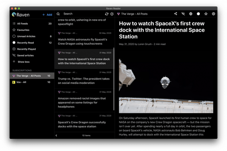 Raven — это бесплатный новостной риидер для Mac, в котором удобно и приятно читать новости и блоги без рекламы и прочего мусора. Программа имеет простой, красивый интерфейс со сменными темами. Так же он предлагает широкий функционал для управления новостями и настройки режима чтения.