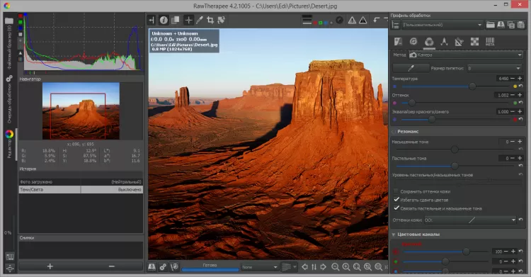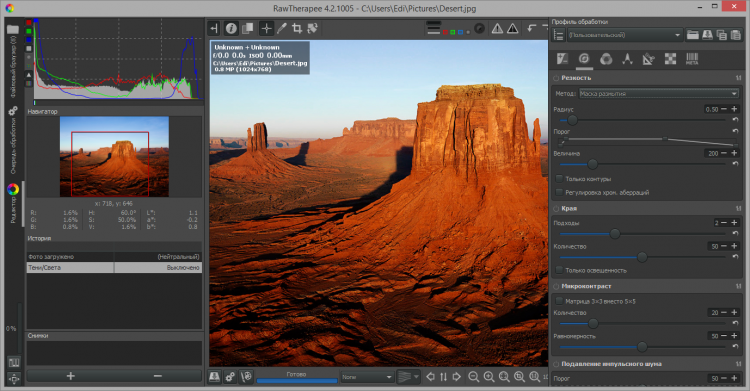 Что же касается обработки фотографий, то тут Raw Therapee способен удовлетворить даже самых требовательных фотографов. Все инструменты удобно сгруппированы по вкладкам на боковой панели, и легко доступны в процессе работы.
