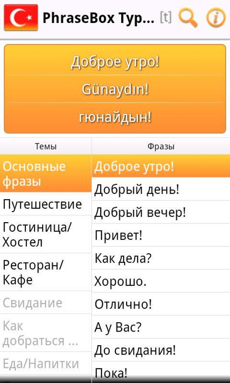 Разговорник Турецкий С помощью данного разговорника Вы сможете легко ориентироваться в стране, путешествовать, объясниться в ресторане, кафе, гостинице, познакомиться с новыми людьми, обратиться за помощью, удачно сделать покупки и многое, многое другое. Каждая фраза переведена и озвучена носителями языка. Прекрасно озвученные аудиотреки позволят Вам общаться с местными жителями даже без знания языка, а также выручат Вас в любых жизненных ситуациях за границей!