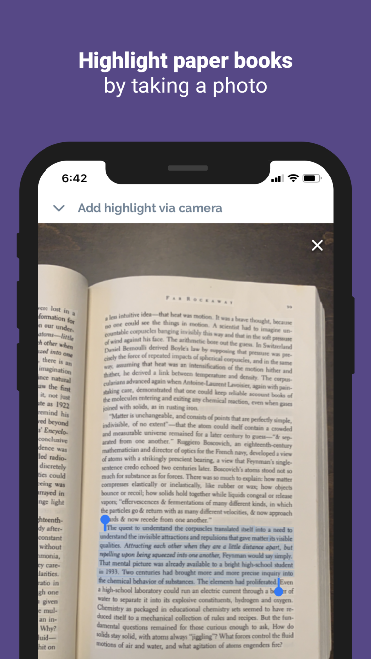 Просто подключите свой аккаунт через приложение, и оно автоматически обновит список ваших книг, а также сохранит для вас список цитат. Кроме того, вы можете указать названия любимых книг, набрав их вручную, или сделать снимок книги и указать нужные идеи. Все сохраненные цитаты будут сохранены в вашей личной ленте, где вы сможете увидеть автора и название книги, а также пообщаться с продвинутым ИИ, чтобы найти похожие идеи в других книгах.
