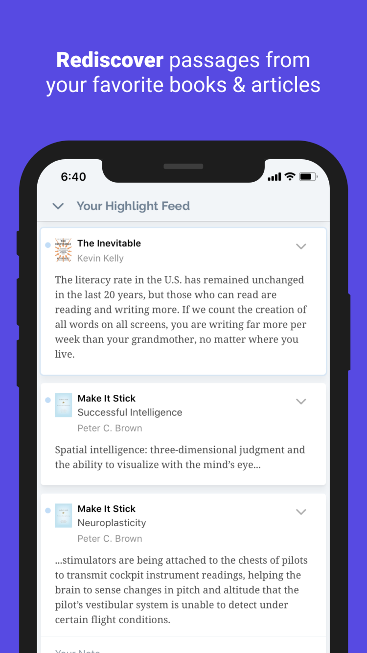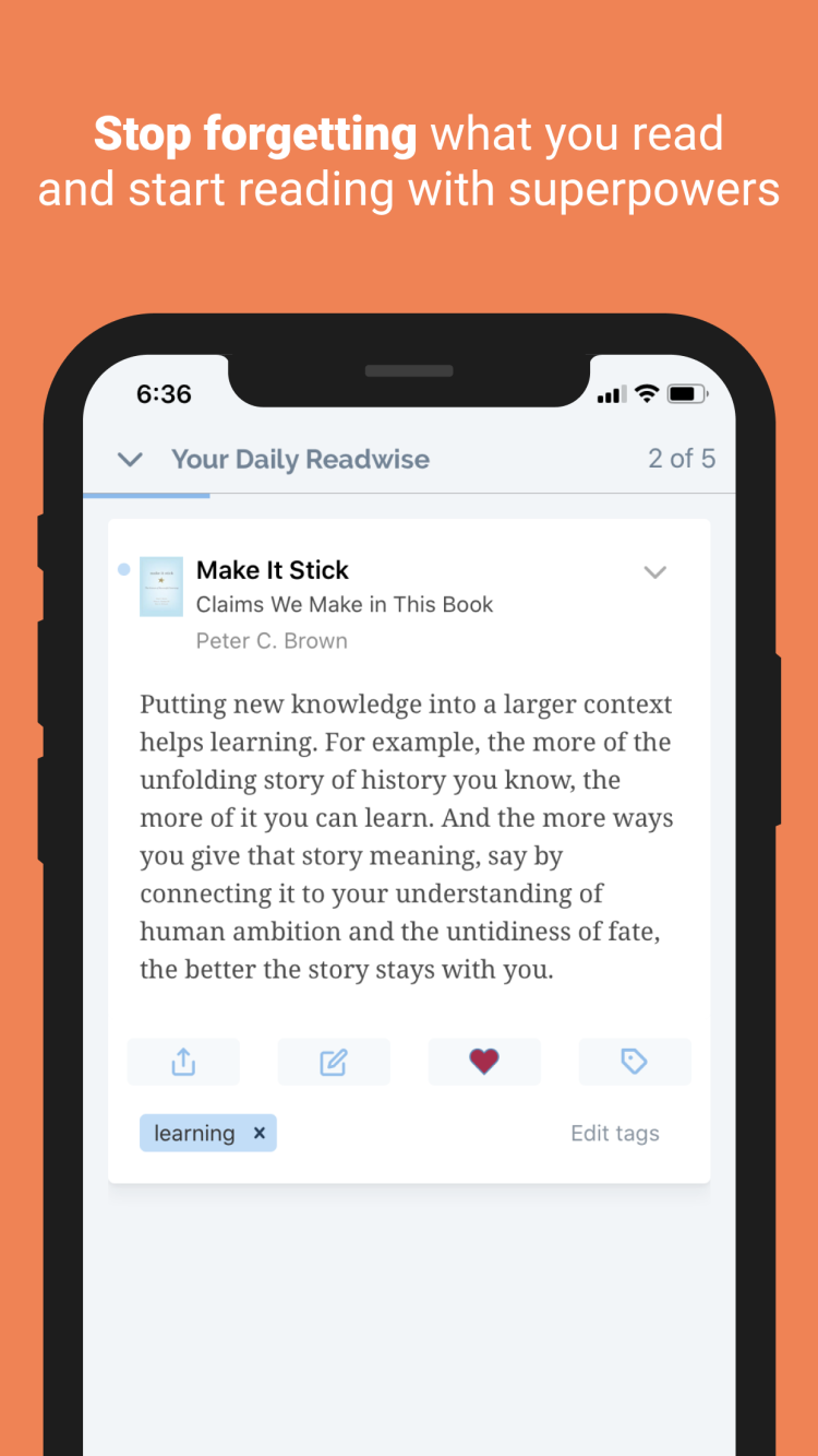 Readwise — это мобильное приложение, призванное помочь вам запомнить самые важные идеи из прочитанных книг. Будь то художественная или учебная литература, программа поможет выделить самые важные идеи и будет напоминать вам о них время от времени.