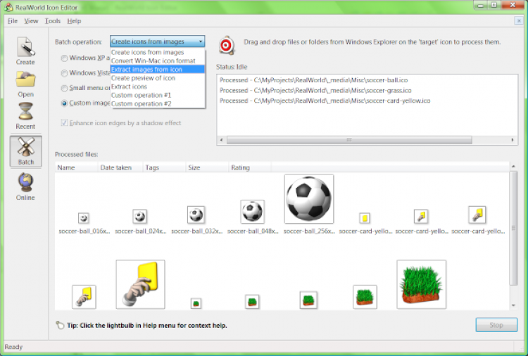 С помощью RealWorld Icon Editor можно конвертировать изображения в иконки, извлекать изображения из иконок, создавать превьюшки для иконок и т.д. Поддерживается пакетный режим обработки иконок. Помимо этого, редактор поддерживает работу с библиотеками .icl. Он позволяет добавлять, удалять и редактировать иконки внутри библиотеки.