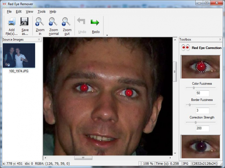 Red Eye Removal - это программа, которая поможет вам устранить эффект красных глаз одним щелчком мыши. Вам не нужно аккуратно выделять глаза на фотографии, программа сделает это за вас и автоматически уберет эффект красных глаз. Red Eye Removal очень проста в обучении и использовании. Вы можете перетащить в нее ваши фотографии и обработать их все за одни раз. В программе есть команды "Отменить" и "Повторить", что позволит вам отменить неудачные преобразования.