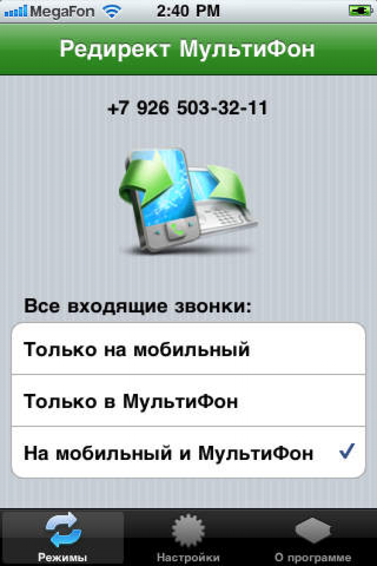 Используя Редирект МультиФон, вы сможете всего одним нажатием на экран своего гаджета переключать режимы входящих вызовов PC/Mobile.