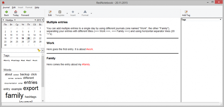 Каждой записи в RedNotebook можно присвоить тег(и). Из этих тегов программа формирует интерактивное облако для более удобной навигации. Еще в программе есть функция поиска записей и удобный календарь, который позволяет просматривать записи по датам.