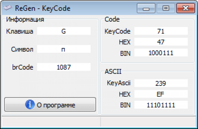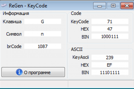 ReGen - KeyCode - это программа, с помощью которой можно узнать код нажатой клавиши. При нажатии клавиши утилита показывает ее символ, а также ASCII и brCode.