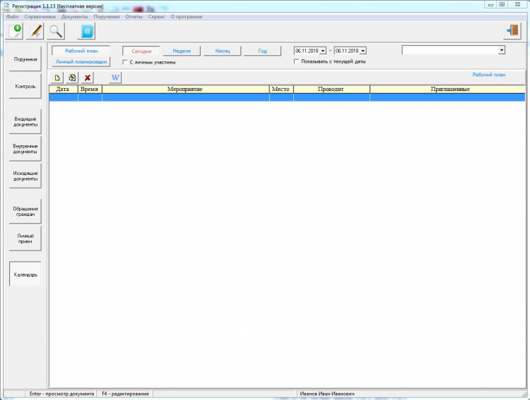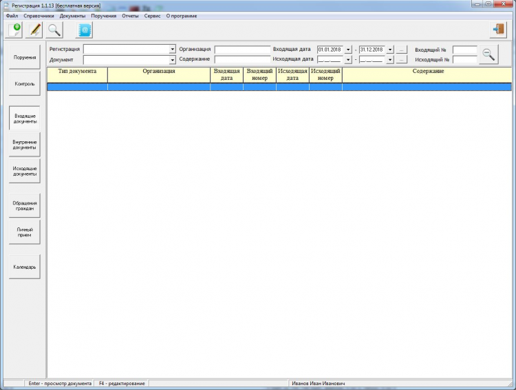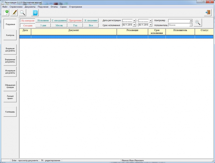 Программа "Регистрация" предназначена для автоматизации учета внутренней, исходящей и входящей документации и контроля исполнительской дисциплины.