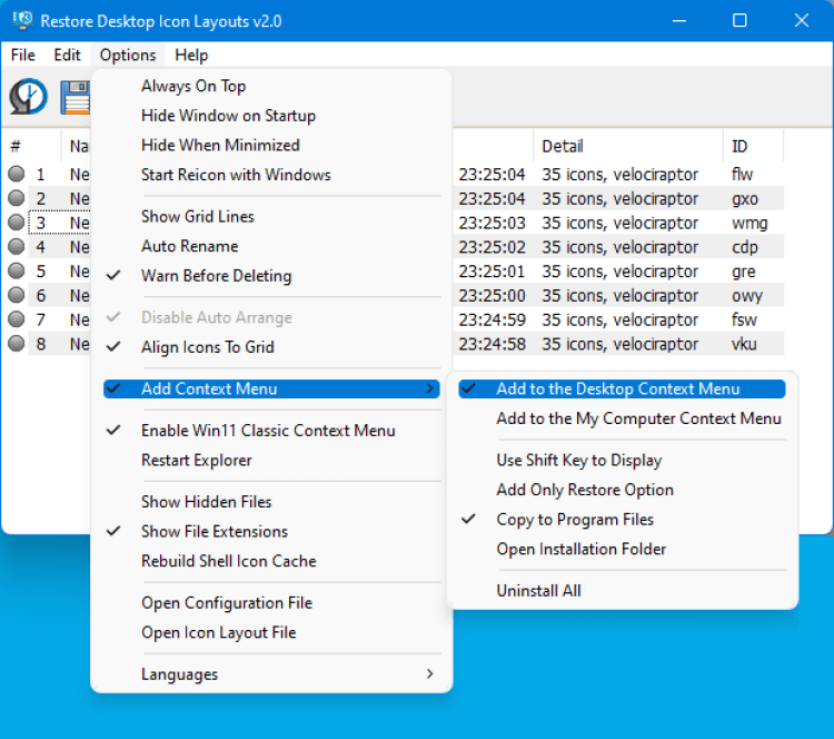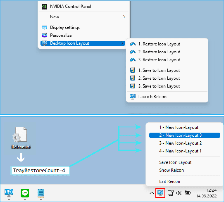 С помощью ReIcon вы можете создать несколько схем расположения иконок на рабочем столе, сохранить и затем быстро переключаться между ними по мере необходимости. Кроме этого, она позволяет включать/отключать отображение скрытых файлов и расширений файлов на рабочем столе. Программа очень проста в использовании, ее не нужно даже устанавливать и можно спрятать в системный трей.