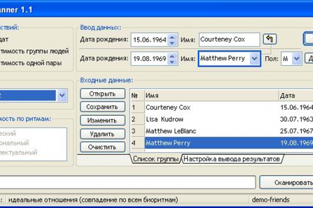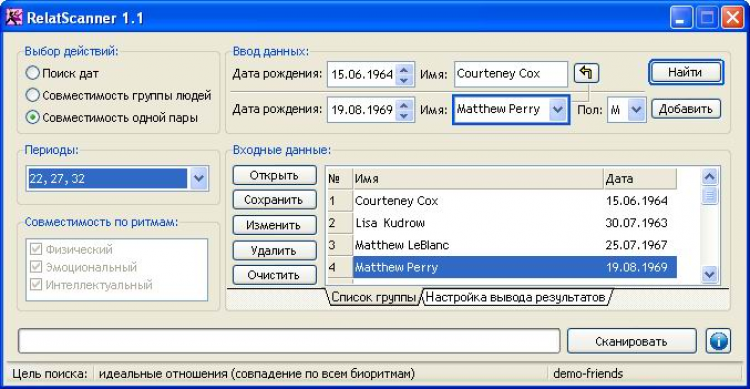 Relatscanner - это программа на основе расчёта биоритмической совместимости производит поиск подходящих дат и определяет биоритмическую совместимость людей.