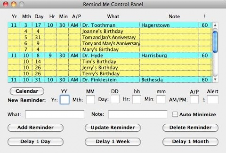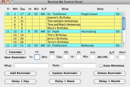 Remind Me Бывало у вас такое, что вы пропускали нечто важное, просто потому что забыли взглянуть в календарь? Тогда эта программа для вас. Программа создана для того, чтобы напоминать о предстоящих праздниках, назначенных встречах и просто значимых событиях. Сообщения появляются большими черными буквами на желтом фоне, таким образом, не заметить их невозможно.