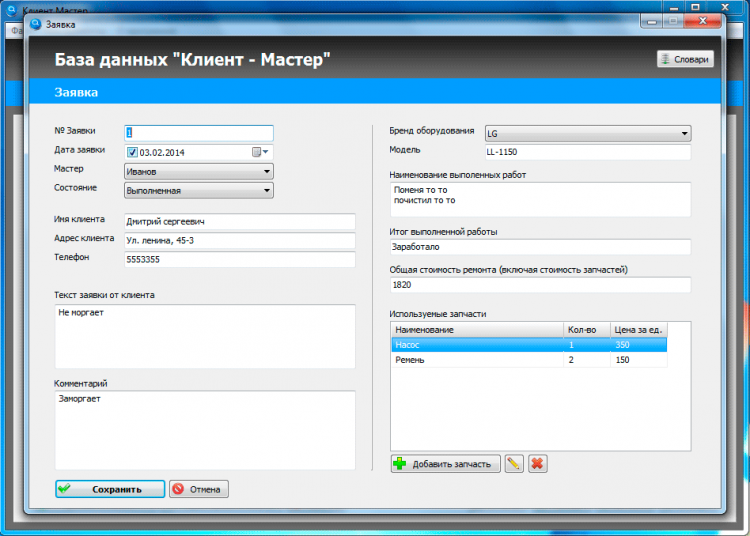 С помощью программы "Ремонтная Мастерская" можно управлять поступающими заявками, отслеживать их выполнение, вести учет доходов и расходов на них. Есть возможность отслеживать работу отдельных мастеров или всего штата сразу. В программе "Ремонтная Мастерская" также есть функция составления подробных отчетов, возможность просмотра и печати заявок за определенный интервал времени, подсчета доходов и т.д. Эта программа является универсальной и подойдет для мастерского любого направления.