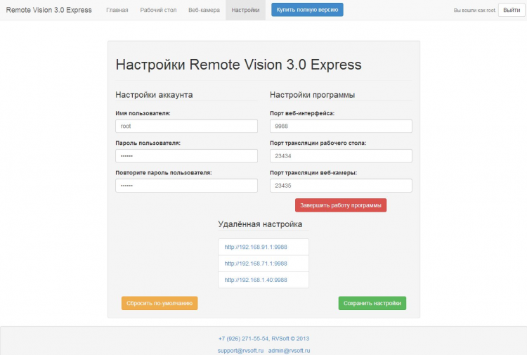 Remote Vision Express Бесплатная версия системы протоколирования рабочей деятельности сотрудника Remote Vision с теми возможностями, которые наиболее популярны. Версия Express постоянно развивается и получает новые возможности. На текущий момент Remote Vision Express обладает следующими возможностями: * Наблюдение за рабочим столом сотрудника. * Наблюдение за подчинённым через веб-камеру. * Авторизация в системе только по Вашему имени пользователя и паролю. * Удалённая работа с системой.