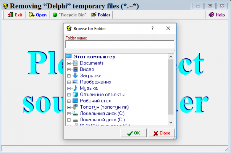 RemoveDelphiTemp Небольшая бесплатная программа для удаления всех временных файлов по маске *.~*. Очень проста в использовании и не занимает много места на компьютере.