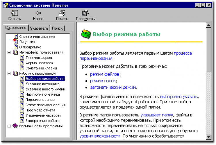 - работа в трех режимах (режим файлов, режим папок и автоматический режим);