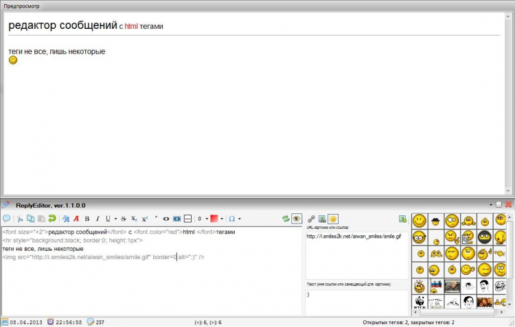 Reply editor - это небольшая программа, с помощью которой можно составлять нехитрые тексты с html тегами, например в форумах, движок которых поддерживает теги форматирования, но авторы сайта поленились (или, пока не дошли руки) во встроенном редакторе прикрутить необходимые кнопки. Продвинутые пользователи в таких случаях, при необходимости, прописывают теги вручную, что не всем удобно и приемлемо.