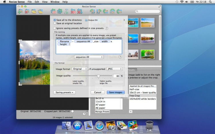 Resize Sense Позволяет изменять размер изображений, обрезать их и конвертировать в пакетном режиме. Обладает гибкими настройками, которые могут быть сохранены в виде шаблона для последующего использования. Сохранять изображения можно в различных форматах. Для переименования файлов можно использовать определенные паттерны.