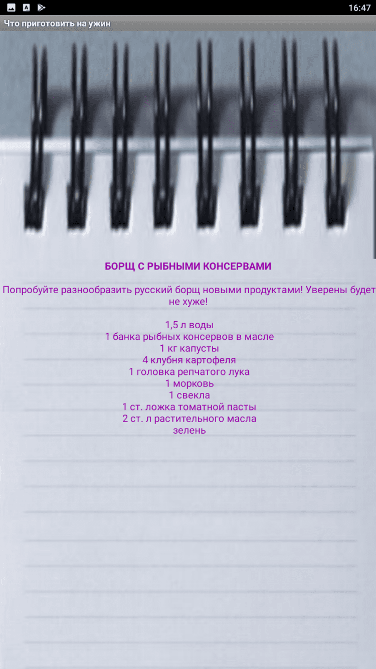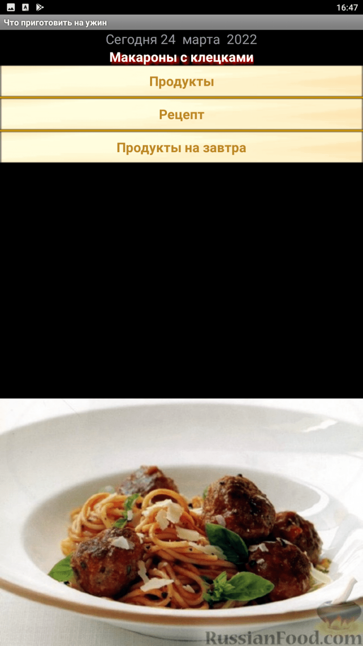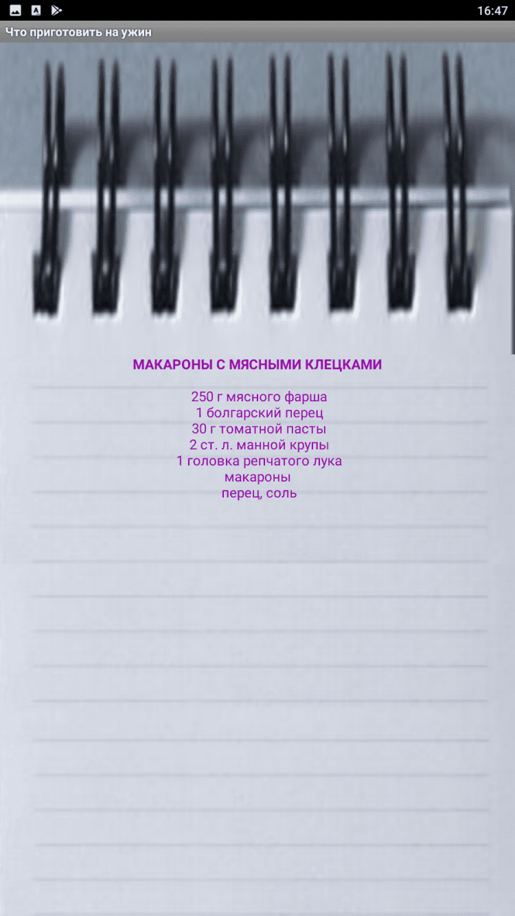 Рецепт на каждый ужин Теперь не надо просматривать тысячи рецептов. Вам предложены рецепты на каждый день, без выбора, просто купите доступные продукты из списка, и приготовьте вечером замечательный ужин. Хочется разнообразия. В поисках рецепта Вы сидите в интернете, скачиваете на телефон программы с тысячами рецептов, а потом мучаетесь в выборе. А в итоге? Готовите, что привыкли. Знакомая ситуация? Тогда это приложение для вас.