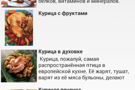 Рецепты блюд из курицы Приложение, содержащее большое количество рецептов вкусных блюд из курицы. Все рецепты с фотографиями. Рецепты можно добавлять в избранное и делиться ими с друзьями. Мясо птицы это очень важный источник белка и ненасыщенных жирных кислот. С диетической точки зрения мясо птицы куда более полезно, чем свинина и говядина, это одна из причин, почему в последнее время потребление этого продукта столь стремительно растет в различных странах.
