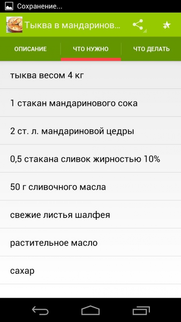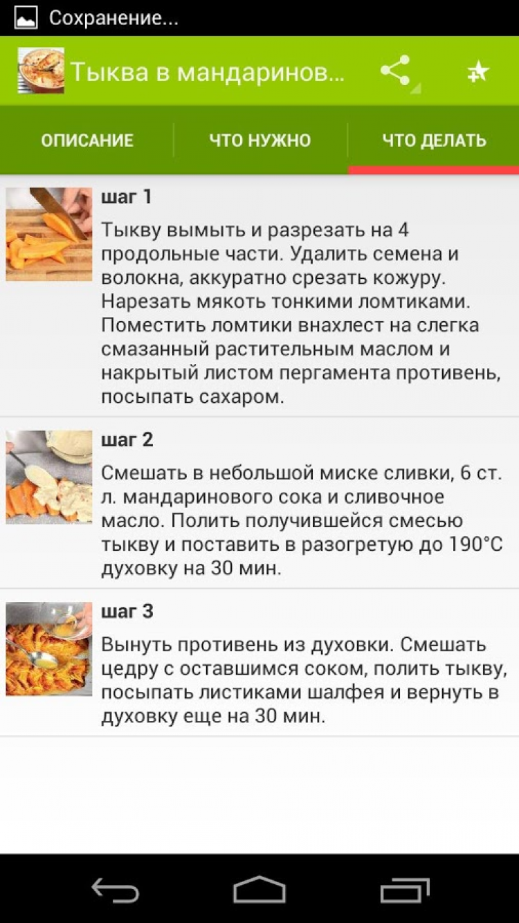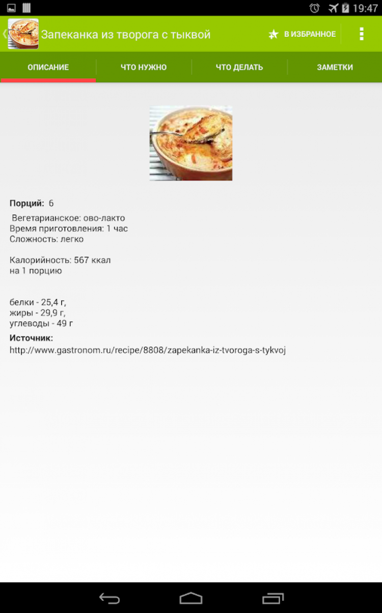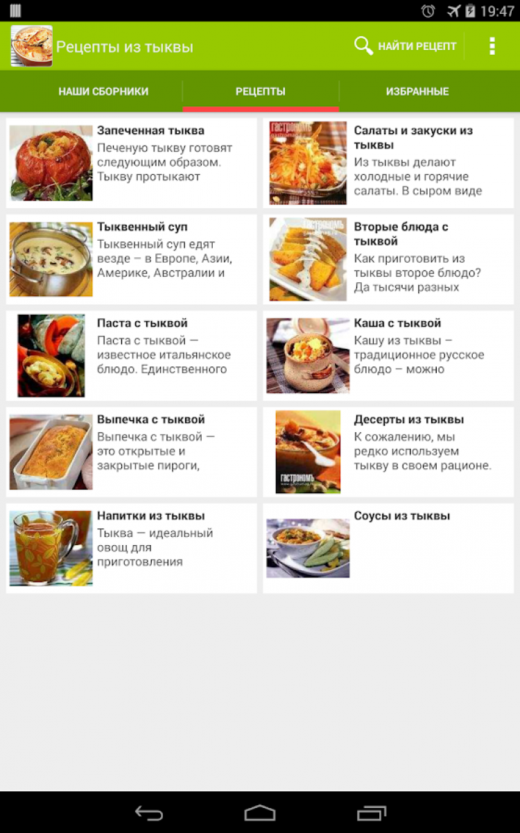 Рецепты из тыквы Приложение, содержащее большое количество рецептов блюд из тыквы. Все рецепты с фотографиями. Понравившиеся рецепты можно добавлять в избранное и делиться ими с друзьями. Блюда из тыквы очень популярны во всем мире. В Европе из тыквы варят суп, готовят запеканки, пюре, салаты, а в австрийской Штирии можно отведать даже тыквенный шнапс и тыквенный кофе.
