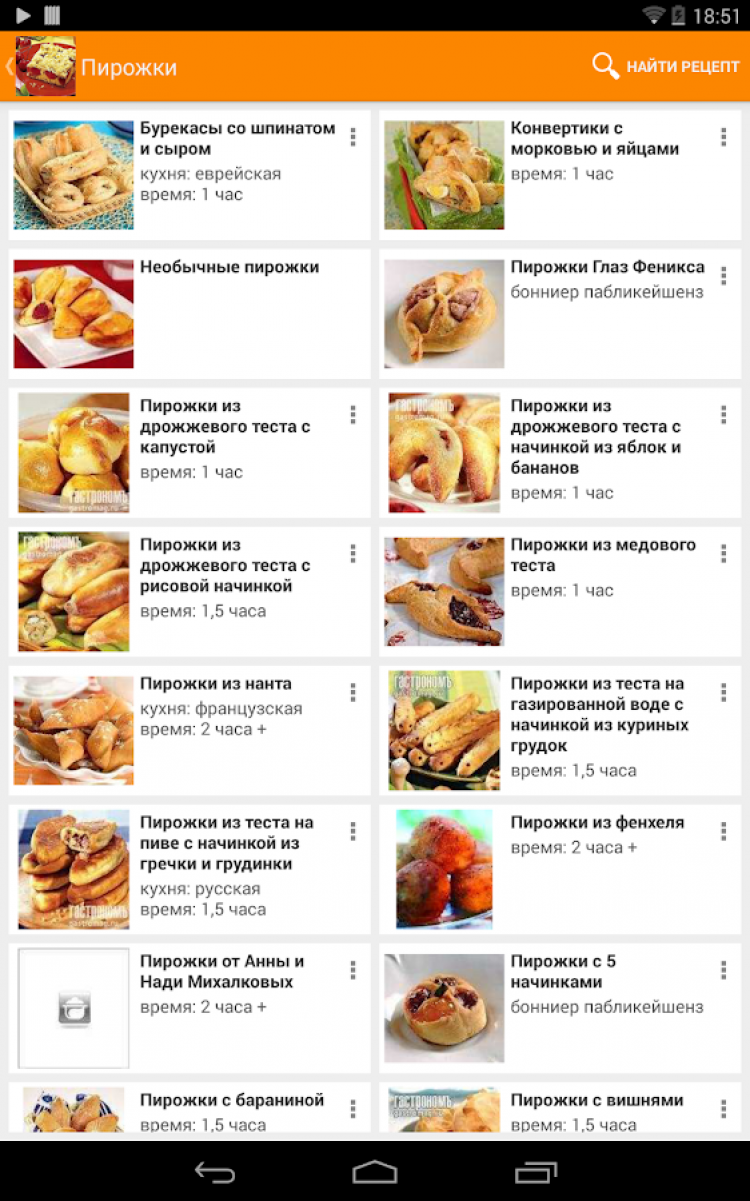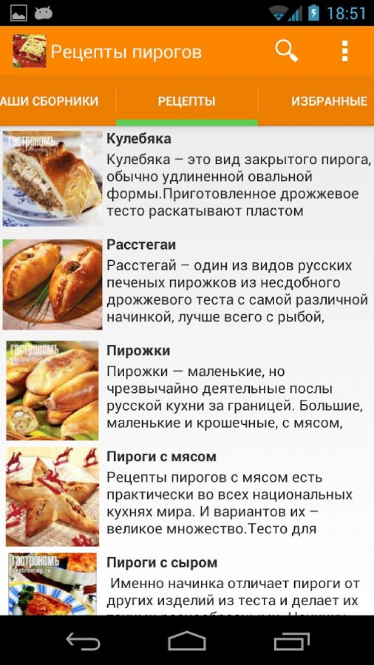 Рецепты пирогов Приложение, содержащее большое количество рецептов вкусных пирогов. Все рецепты с фотографиями. Понравившиеся рецепты можно добавлять в избранное и делиться ими с друзьями. Пироги – это выпечка с начинкой. Именно начинка отличает пироги от других изделий из теста и делает их такими разнообразными. Начинку для пирогов делают сладкой (ягоды, фрукты, творог, мак) и несладкой (овощи, мясо, рыба).