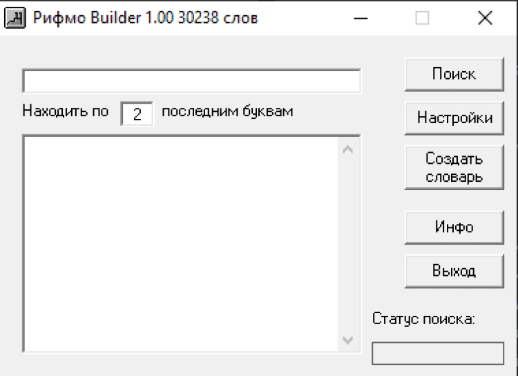Рифмо Builder - это программа поможет вам подбирать рифмы к заданым словам. Также можете легко создавать / обновлять словари в которых будет осуществляться поиск слов.