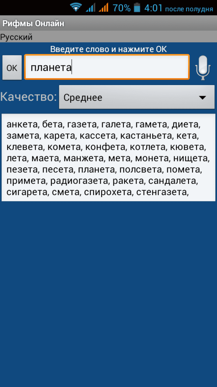 Все мы пишем стихи время от времени. Иногда по настроению, иногда мы хотим сделать приятное любимому человеку, другу или родственнику. Или удивить. Создание стихотворения очень сложный процесс. Нужен талант. Надо уметь не только выразить мысль, но и передать её лаконично и красиво. Кроме того, нужно чувство ритма и рифмы. Наше приложение поможет вам с последним, с рифмой. Впишите слово (с помощью клавиатуры или с помощью голосом), которое вам нужно срифмовать. И наша программа найдет вам все рифмы, которые имеются в базе данных. Создавайте и удивляйте.