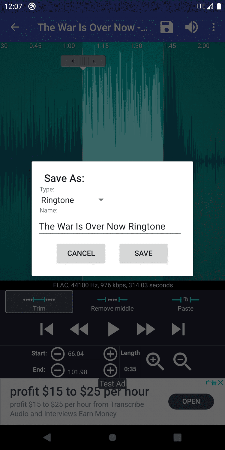Редактор Рингтонов - это лучший инструмент для создания мелодий звонка в Маркете, улучшенная версия Ringdroid, с добавлением таких возможностей, как эффекты возрастания/затухания для MP3, регулировка громкости, и отправка по e-mail. В последней версии вы также можете копировать, вырезать и вставлять фрагменты музыки.