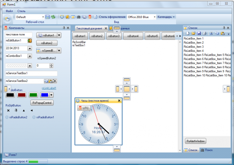 RsDesign.Controls for WinForms Библиотека элементов управления RsControls состоит из 48 различных компонентов включая RsDataGridView и RsDockingForms. Все элементы управления поддерживают собственные визуальные стили: Visual Studio 2010, Office 2007, Office 2010. Возможно создание и подключение других стилей. Это Open Source - проект по лицензии LGPL v.3.